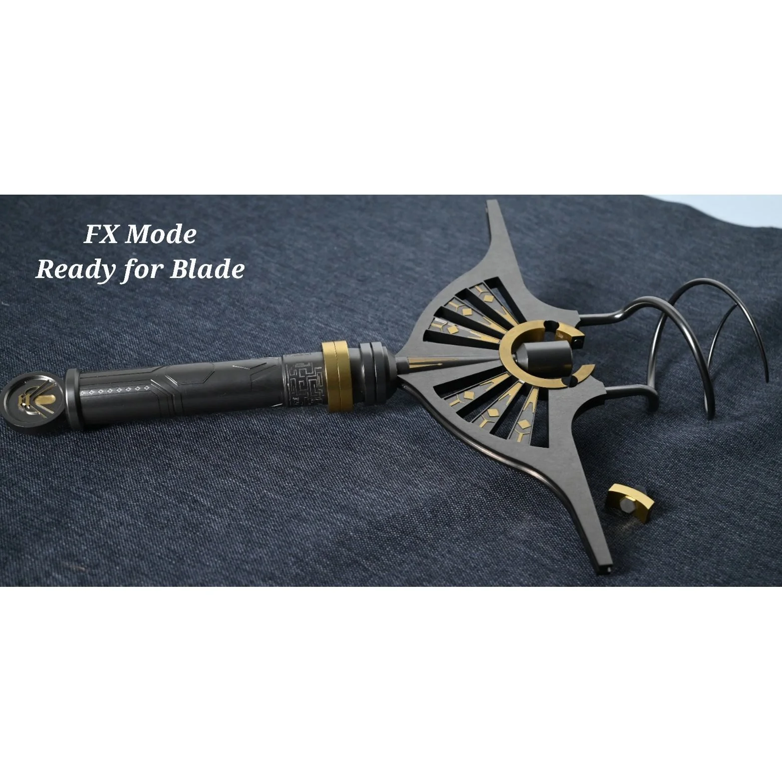 A static display (remove the blade holder cup, and thread on the display piece). Attach the magnetically attached top of the circle gold piece (that holds the crystal).
